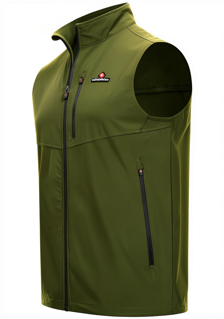 Le gilet est disponible en tailles S, M, L, XL, XXL et 3XL, avec des options de couleurs comme vert, noir, bleu foncé et gris pour s’adapter à différentes morphologies.