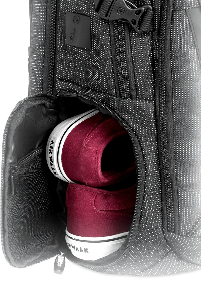 Le compartiment principal offre un espace généreux pour un ordinateur portable jusqu’à 17 pouces, avec un sac à chaussures interne supplémentaire, permettant de transporter des articles personnels comme des dossiers ou des vêtements légers.