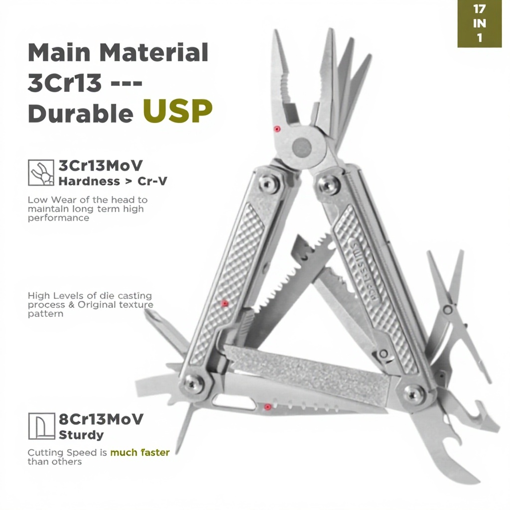 La pince multifonction Swiss+Tech 17 en 1 combine robustesse et polyvalence avec sa tête en acier inoxydable et son couteau en 8Cr13MoV. Compacte et légère à 265 g, elle est parfaite pour le camping, la randonnée ou le bricolage. Son design exquis et sa structure autoverrouillée garantissent sécurité et facilité d’utilisation.